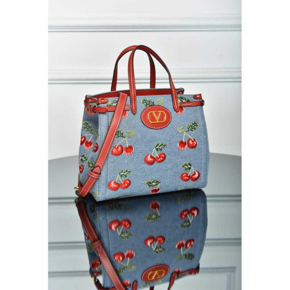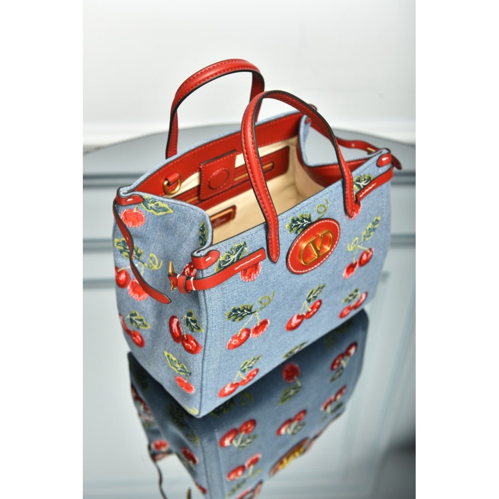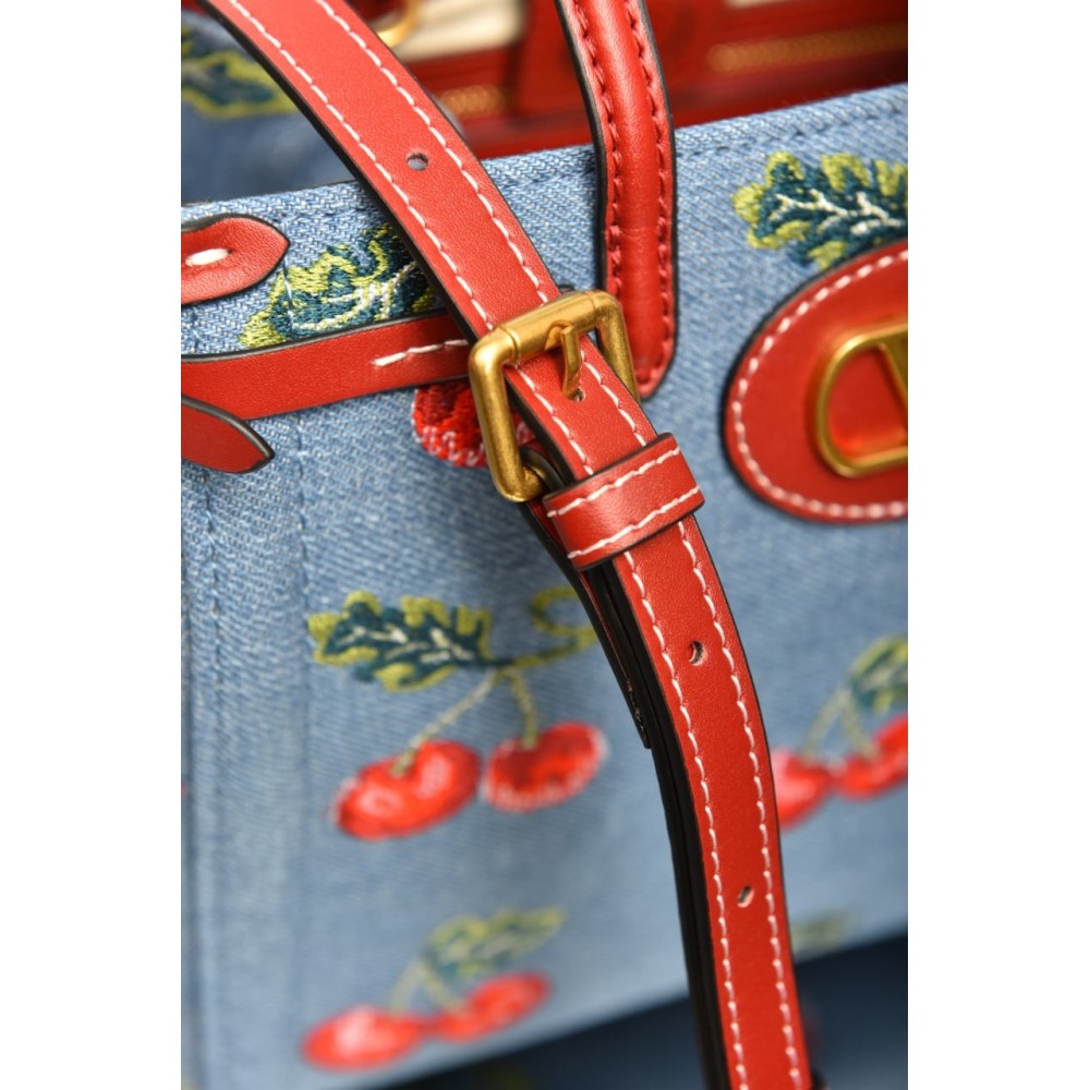 Valentino Garavani Antibes Small Shopping Bag in Denim with Cherryfic Embroidery