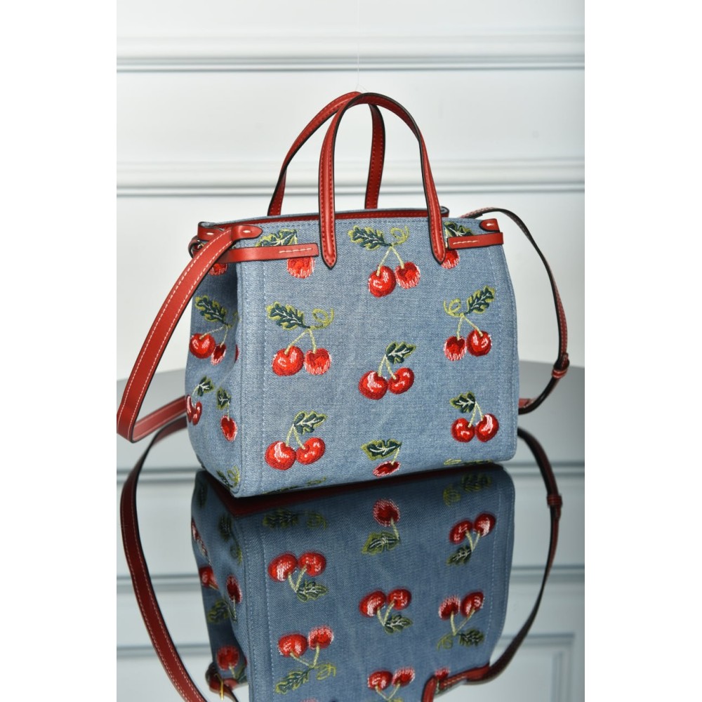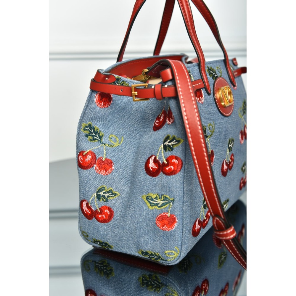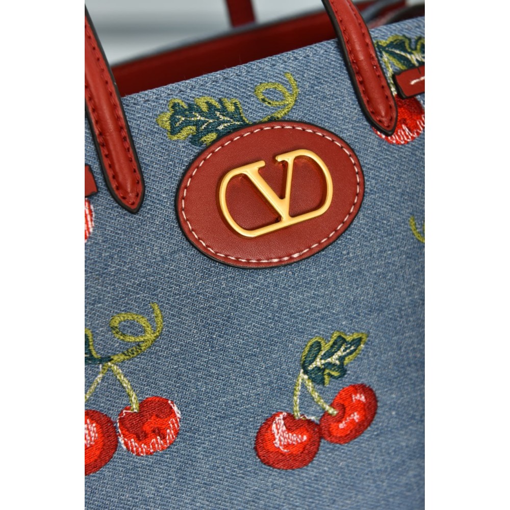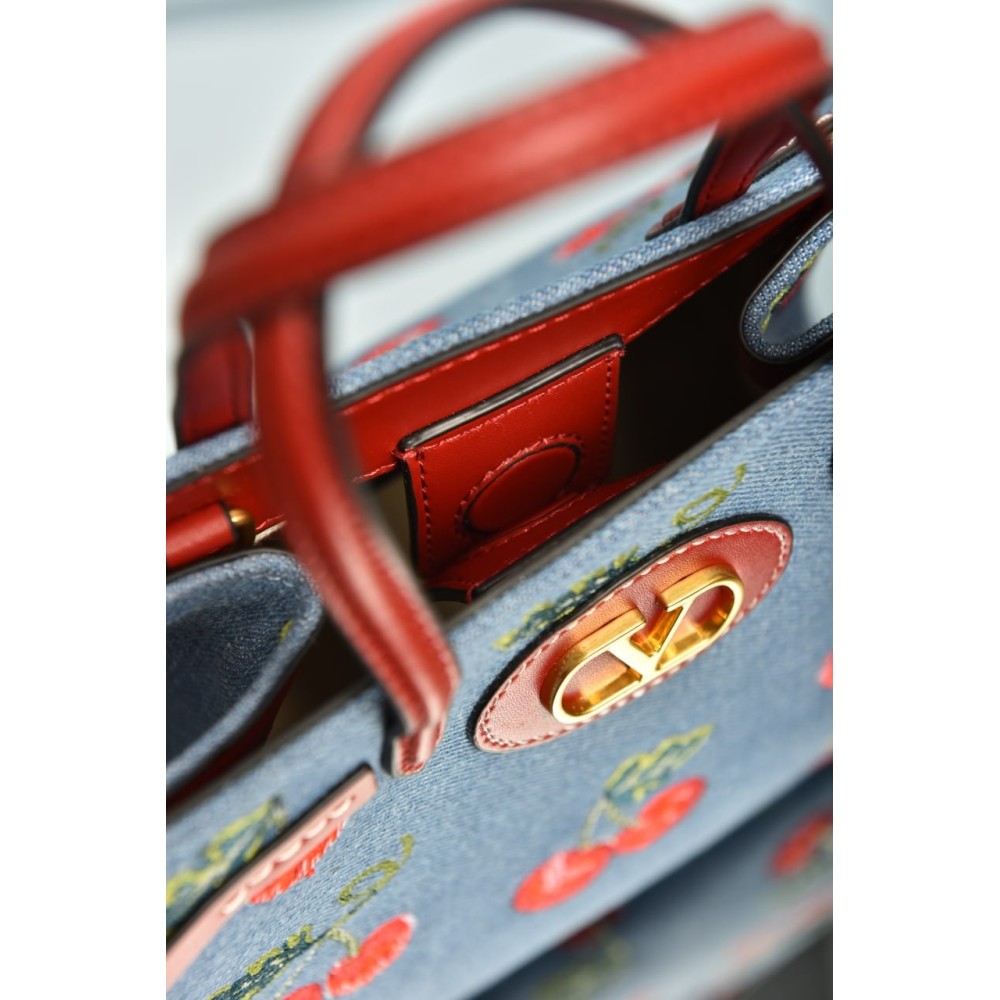 Valentino Garavani Antibes Small Shopping Bag in Denim with Cherryfic Embroidery